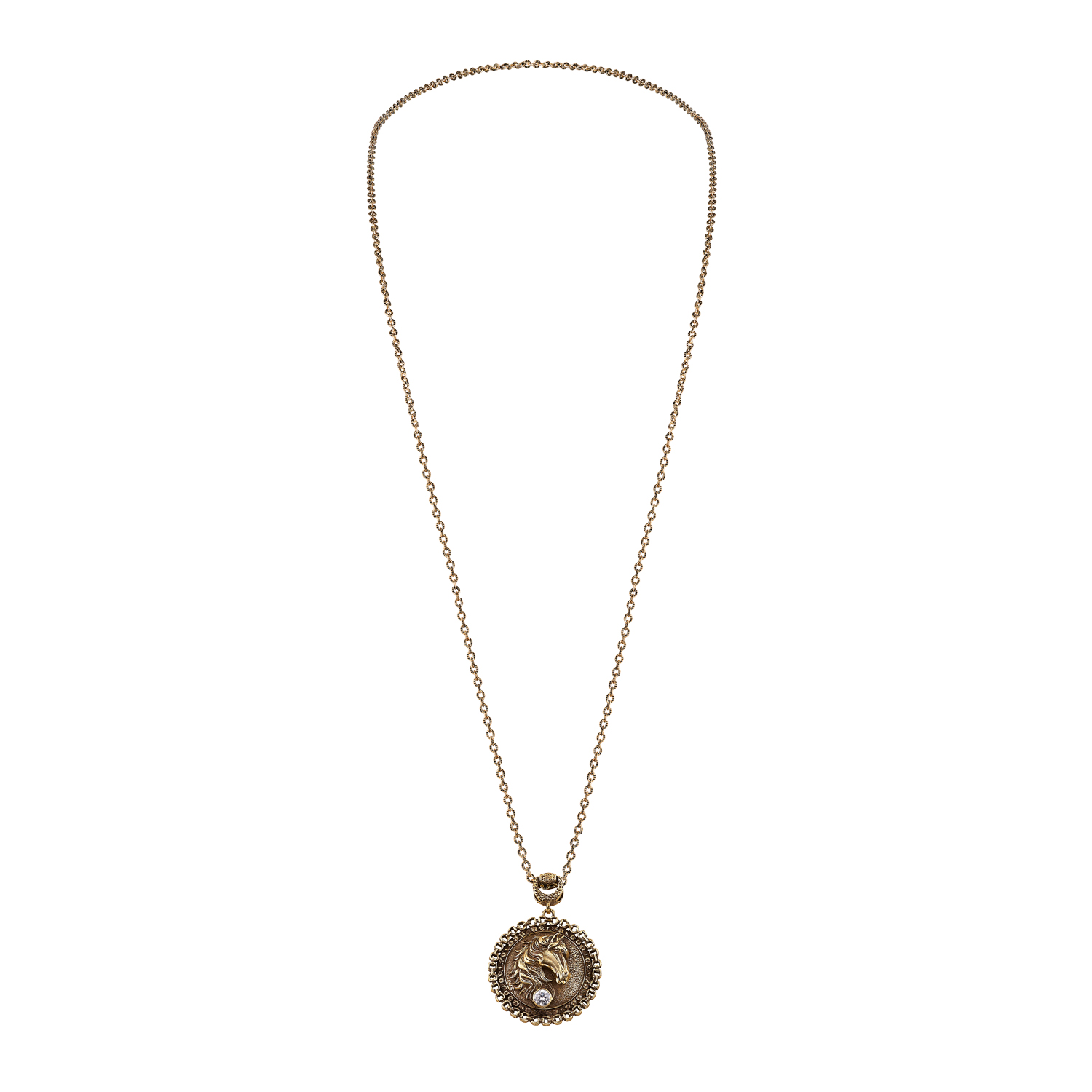 Подвеска ручной работы CAVALLO. Лошадь, это символ жизненной силы, красоты, грациозности, мощи и завораживающего гармоничного движения. Итальянский дизайн. Состав: ювелирный сплав - Brass (латунь), гальваническое покрытие - нанокерамика, патинирование, фианит. Цвет: античное золото, прозрачный. Размер: высота 4,9 см, цепь 70 см. Вес: 22,7 гр.