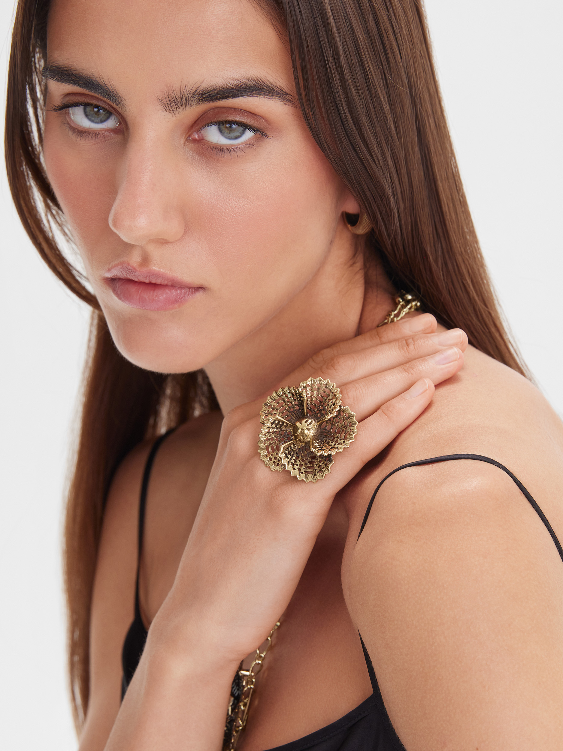 Кольцо ручной работы VENTAGLIO. Итальянский дизайн. Состав: Brass (латунь) с гальваническим покрытием - нанокерамика. Цвет: античное золото. Размер: универсальный, диаметр цветка веера 4,5 см, возможность расставить шинку 15,5 -18,5 RUS. Вес 13.3 гр.