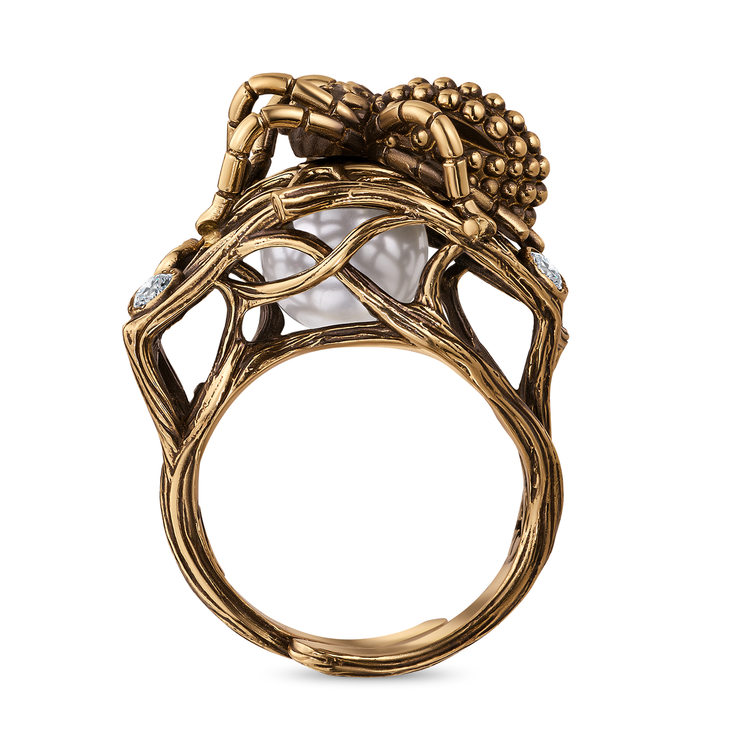 Состав: Brass (латунь), гальваническое покрытие -нанокерамика, патинирование, фианиты, искусственный жемчуг. Цвет: античное золото, бесцветный, черный. Размер: универсальный, возможность расставить шинку с 17-19 RUS, вес 12,3 гр.