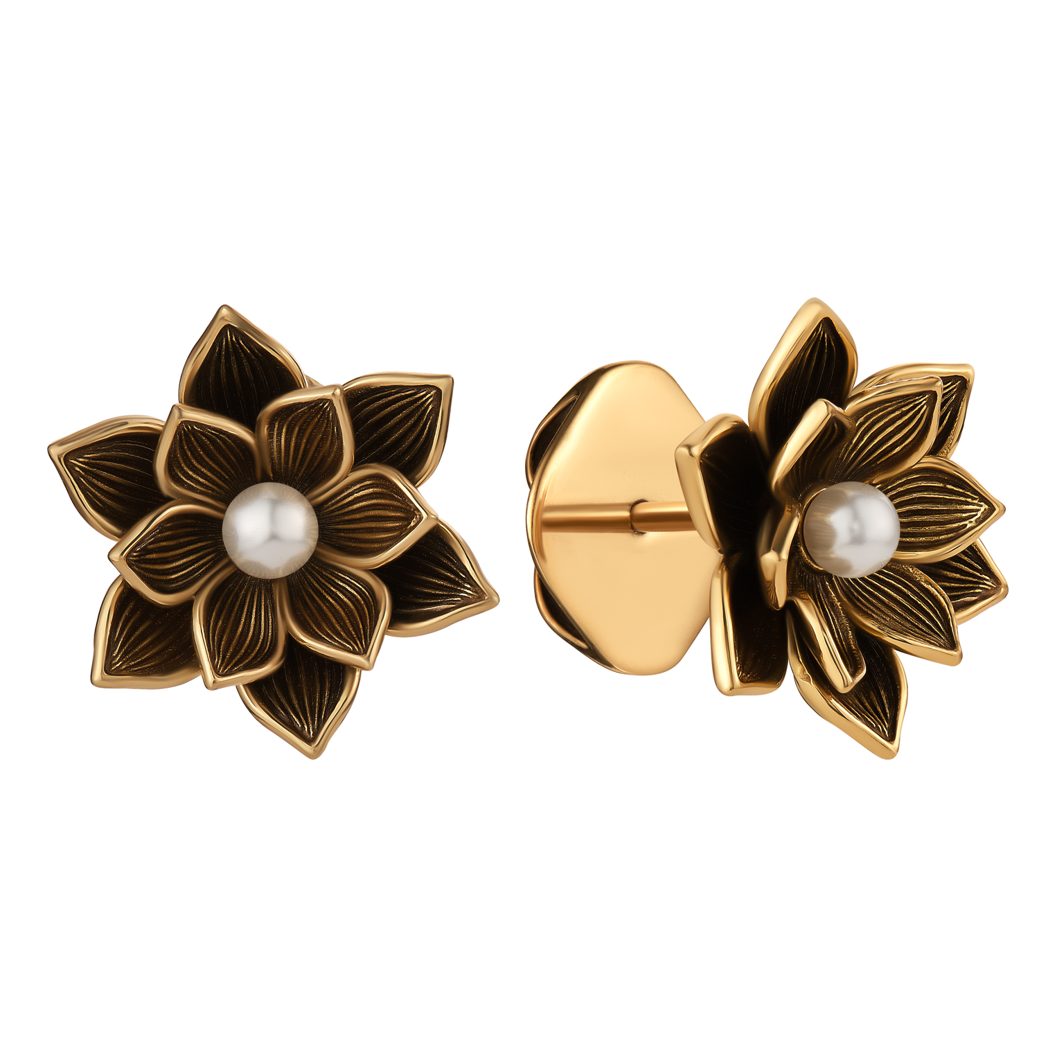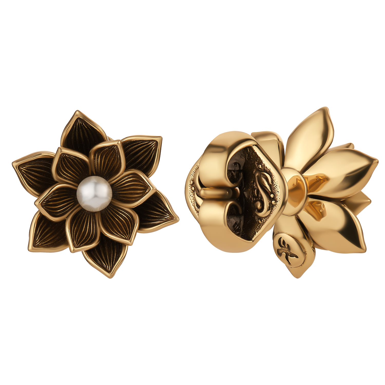 Серьги - пусеты LOTO ручной работы. Итальянский дизайн. Лепестки лотоса, хранящие драгоценную жемчужину. Состав: Brass (латунь), гальваническое покрытие - нанокерамика, искусственный жемчуг, патинирование. Цвет: античное золото, естественный жемчужный. Размер: высота 1,6 см, застежка - пусет. Вес 4,5 гр. за пару