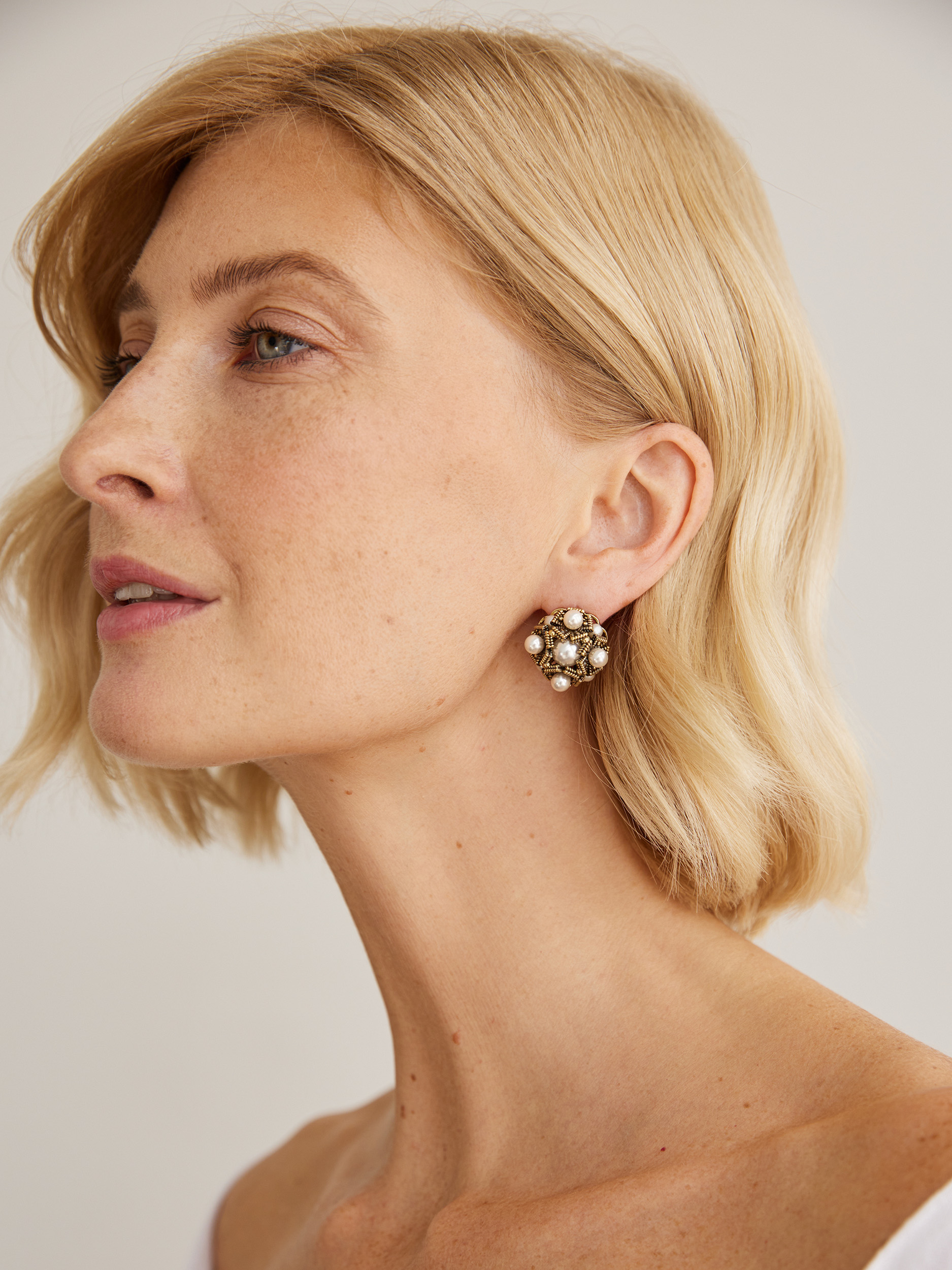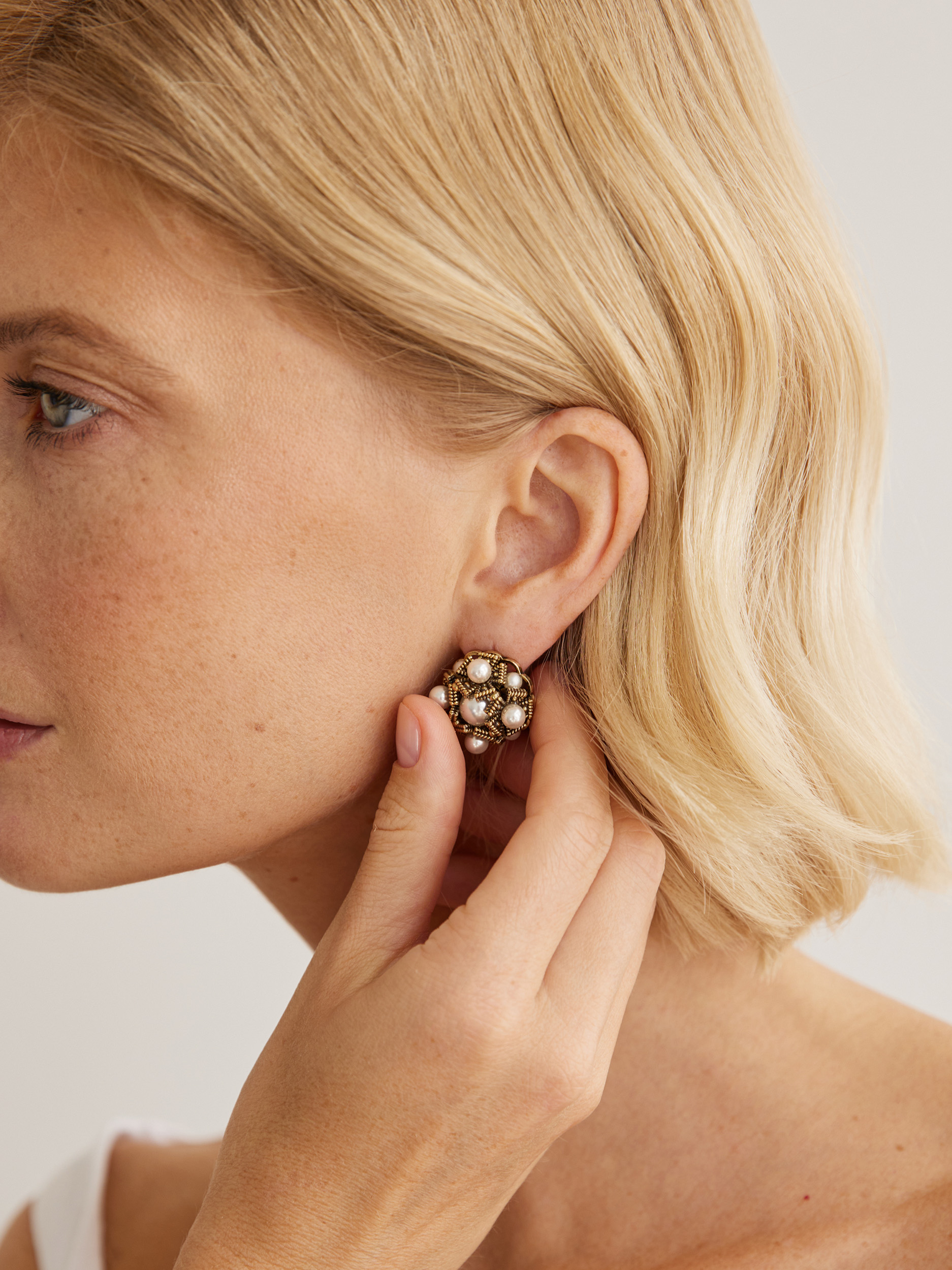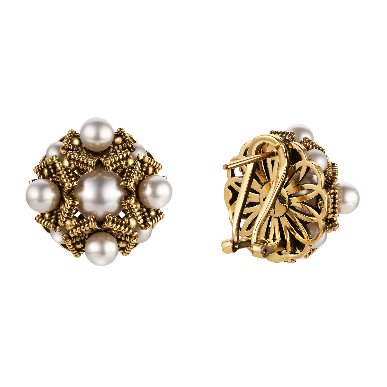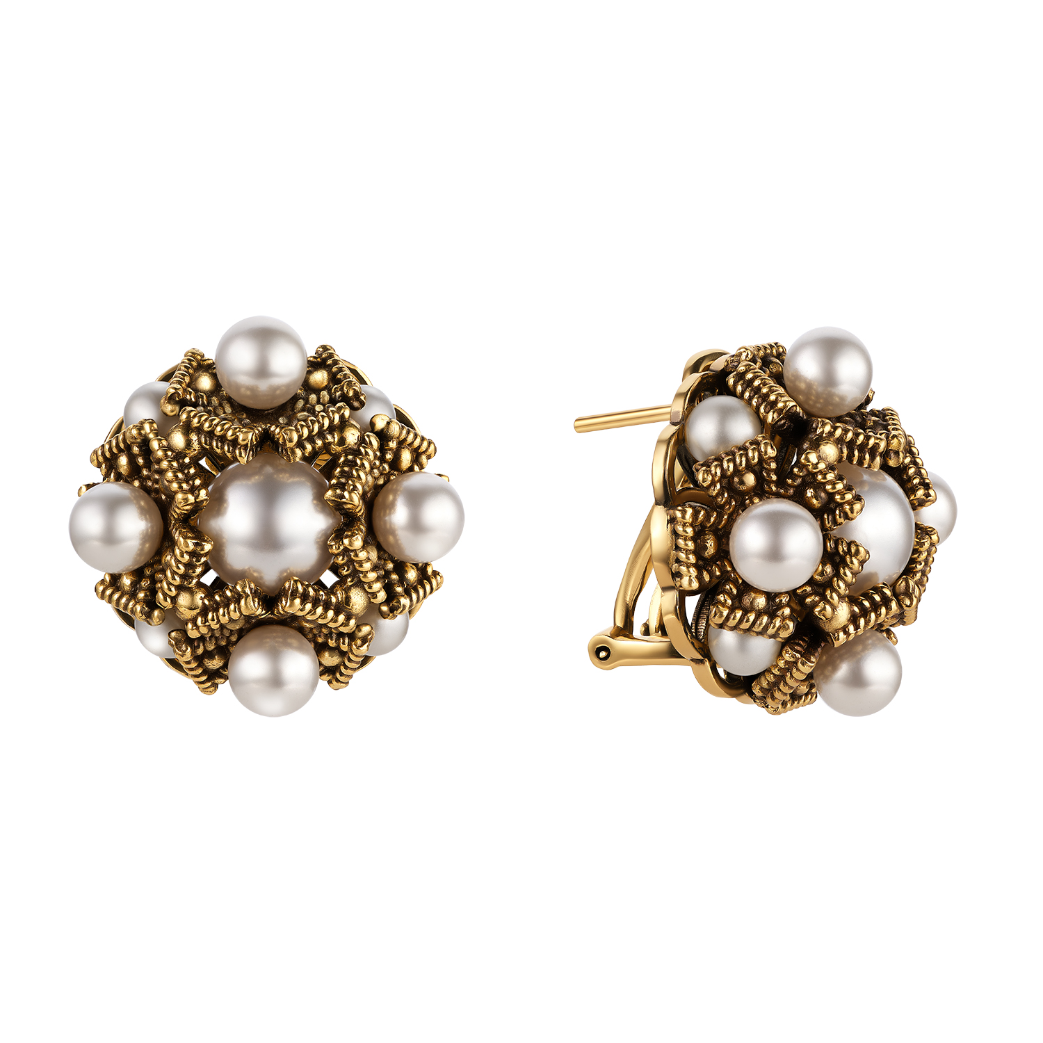 Серьги ручной работы ORDINE FIORENTINO. Итальянский дизайн. Состав: Brass (латунь), гальваническое покрытие - нанокерамика, патинирование, искусственный жемчуг. Размер: 2 см., застежка - итальянский замок. Цвет: античное золото, белый. Вес 19,1 гр. за пару.